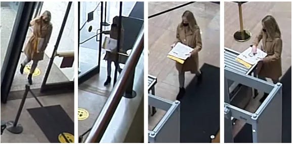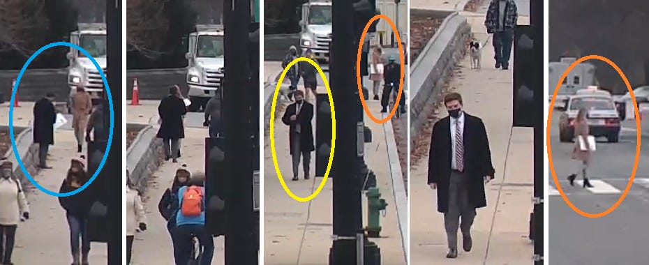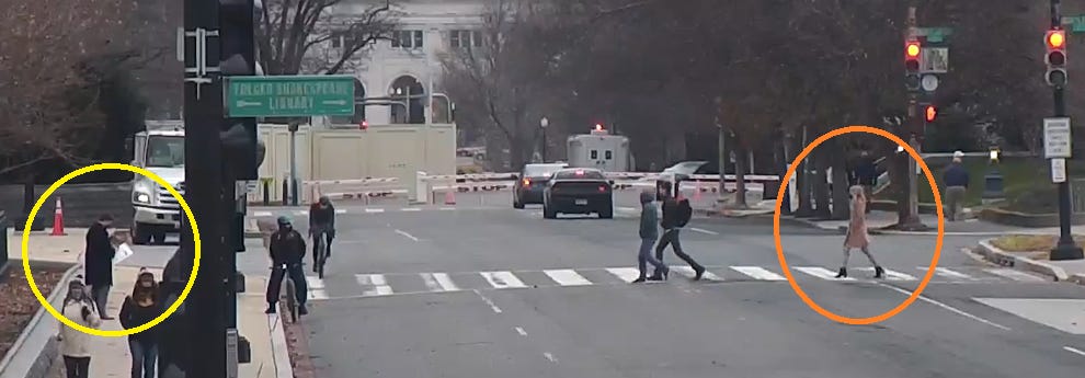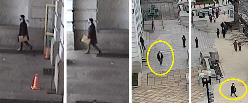 This woman exits at 12:13 pm, walks down Constitution Avenue, turns on First Street, and a few minutes later stops in front of the U.S. Supreme Court. (Visual note - at this point, she is not carrying anything in her hands.)