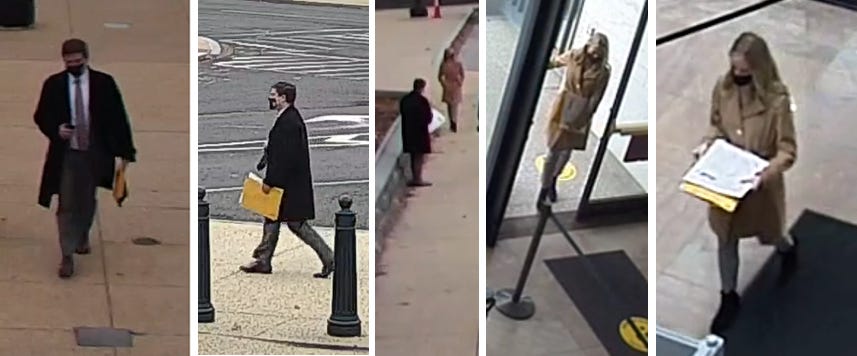 Security videos from Jan. 6 show (left) a staffer from the office of Rep. Mike Kelly (R-PA) walking with fake elector documents from Michigan and Wisconsin. That aide handed off the documents across the street from the U.S. Supreme Court to a woman (right), who walked back to the Hart Senate Office Building, home to the office of Sen. Ron Johnson (R-WI). Minutes later, Johnson’s office tried to get the documents to Vice President Mike Pence.