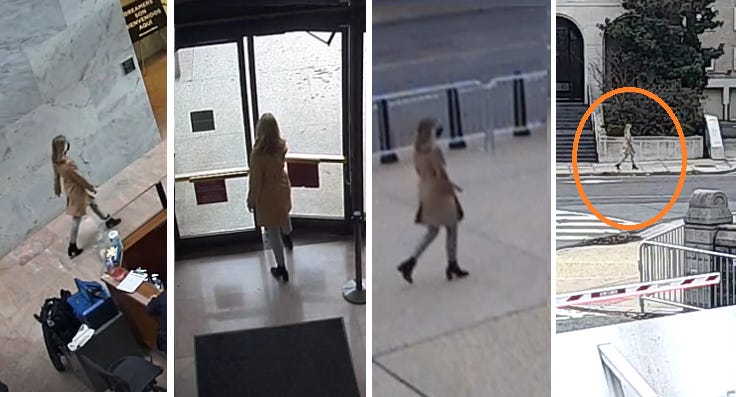 Heading back to his office, the Kelly staffer is now empty-handed, while the woman can be seen carrying the two envelopes with the fake elector documents. It was 12:20 pm. The Joint Session would convene in 40 minutes.