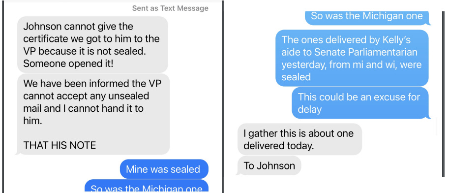 "Johnson cannot give the certificate we got to him to the VP because it is not sealed," Troupis texted Kenneth Chesebro at 1:02 pm. "Someone opened it!"