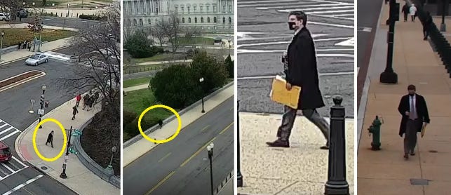 Instead of trying again to deliver the certificates to the Senate Parliamentarian, security cameras show the Kelly staffer walking around the perimeter of the Capitol grounds, past the Library of Congress, and towards the U.S. Supreme Court. He stops across from the Court at 12:18 pm.