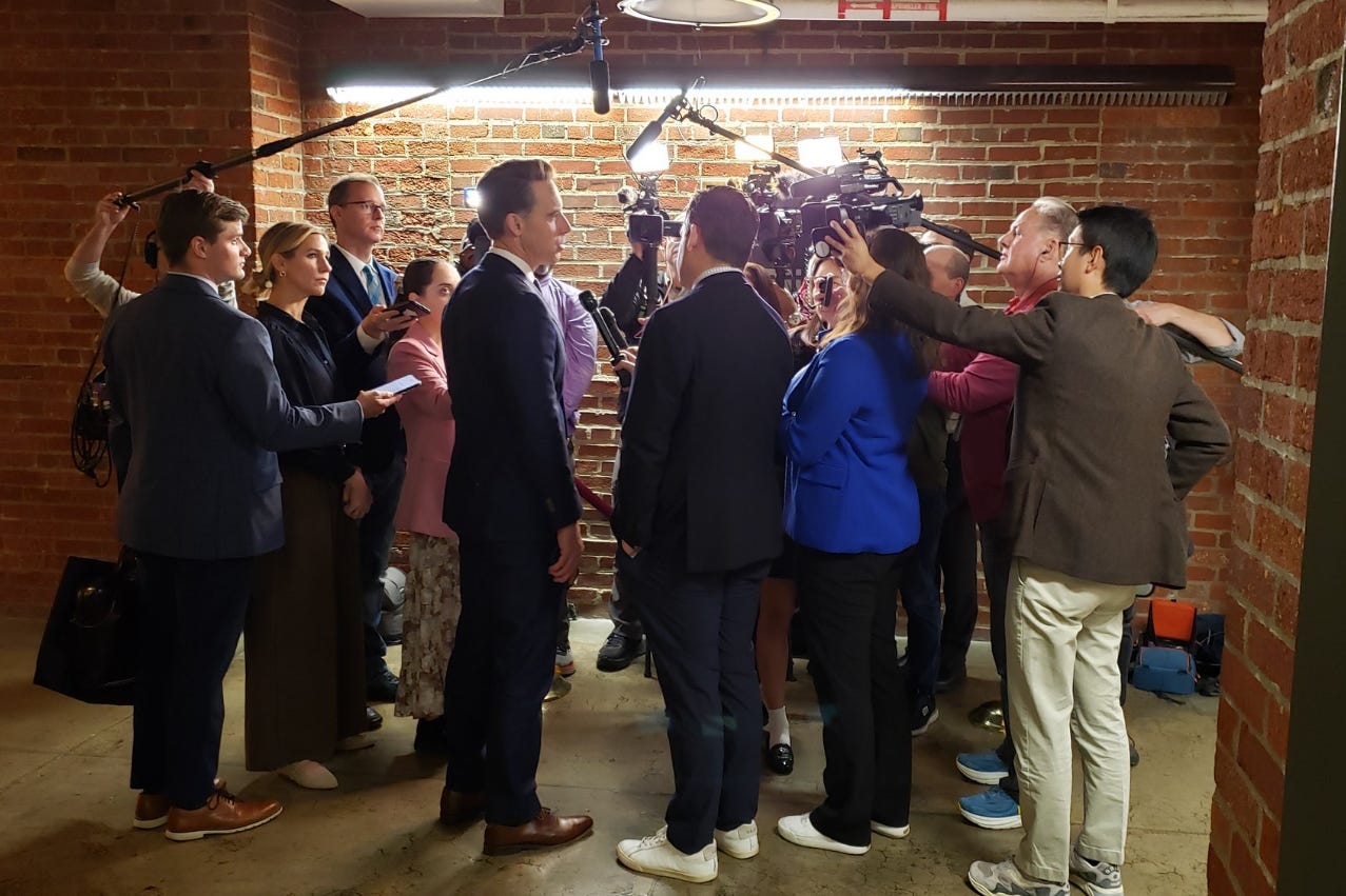 BEHIND THE SCENES. I told you earlier this month about how protesters often pursue lawmakers as they head for the tunnels to the Capitol - but TV cameras and crews do not. Instead, TV reporters have one spot in the basement for stakeouts . This is in the Russell Senate Office Building. You can see reporters talking to Sen. Josh Hawley (R-MO).